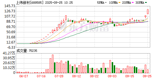 上纬新材股价创出历史新高,截至9:30,该股上涨6.29%,股价报117.00元,成交量80.74万股,成交金额9370.86万元,换手率0.20%,该股最新A股总市值达471.93亿元,该股A股流通市值471.93亿元。